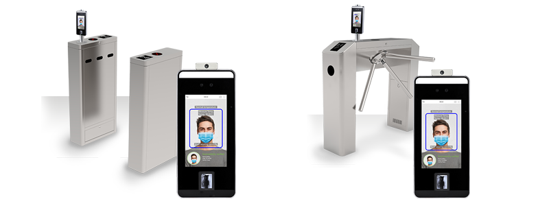 Safely screen employees or visitors wearing masks for high temperatures as they walk into buildings or defined areas with Access Control Turnstiles with Facial Recognition Biometrics, an indoor speed gate series for convenient contactless access control which features a modular reader panel design.