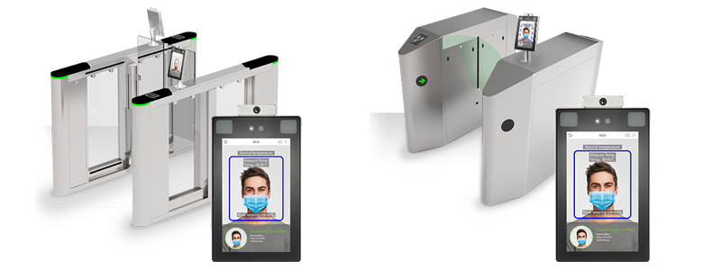 Safely screen employees or visitors wearing masks for high temperatures as they walk into buildings or defined areas with Access Control Turnstiles with Facial Recognition Biometrics, an indoor speed gate series for convenient contactless access control which features a modular reader panel design.